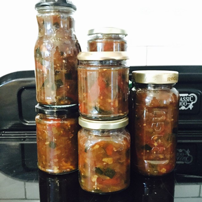 I’m calling this my autumn chutney as it’s being made with the very last of our homegrown produce as October approaches and the evenings draw in. It’s actually a mix of several of my chutney recipes put together and utilises a good couple of those overgrown courgettes and some windfall apples. Making it now means it will be just about perfect in time for Christmas. This recipe made around ten medium jars in various sizes ranging from 200ml to 450ml.