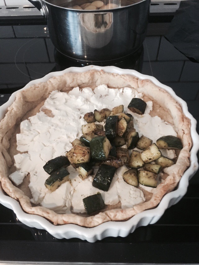 3. Remove the pastry case from the oven, then smooth the soft goat’s cheese over the base so that it has a light covering all over and add your cooked courgettes in an even distribution.