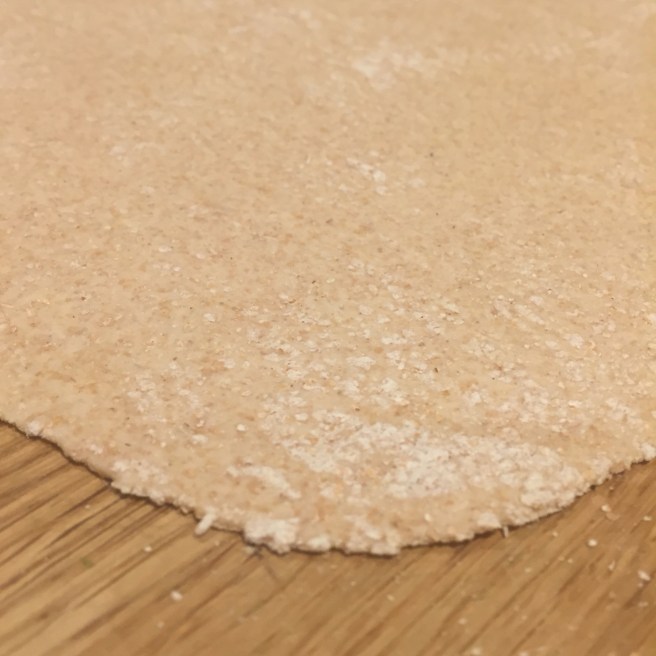 Cut the dough in half and roll out on a floured worktop into something resembling a circle. It is important to get it quite even and quite thin. Repeat with the other piece. Use your rolling pin to transport it.