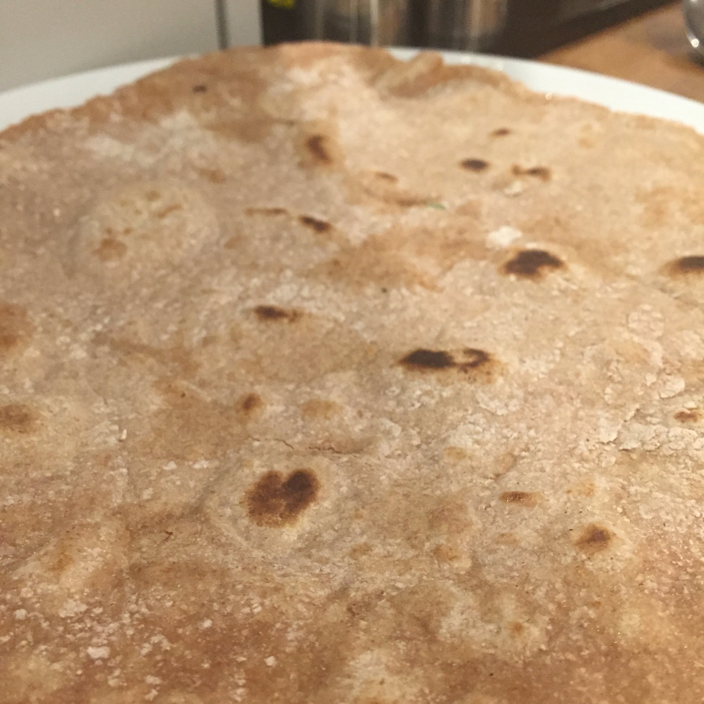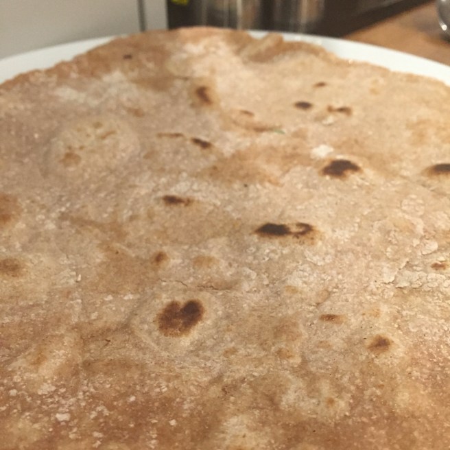 Get your largest non stick pan as hot as you can on the hob and place the first flatbread in. After about two minutes it will start to colour. Turn. Remove from pan and repeat with the other piece.