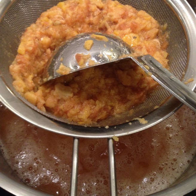 Use a ladle to bring scoops of the pulp into a fine metal sieve over a large measuring jug and work through until you have a juicy pulp in the jug below. Measure this into a large deep saucepan. Repeat until all the fruit is sieved and you know how much pulp you have.