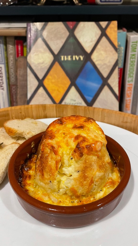 When you are ready for the second bake, run a knife around the inside of the pot to allow the soufflé to drop out, and upturn the pot onto a suitable receptacle – I use little terracotta tapas dishes. Remove the greaseproof paper if it has come with the soufflé, and then pour over 30ml of double cream, before topping the soufflé and cream with a little more cheddar and Parmesan.