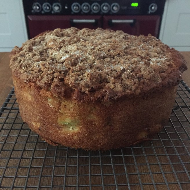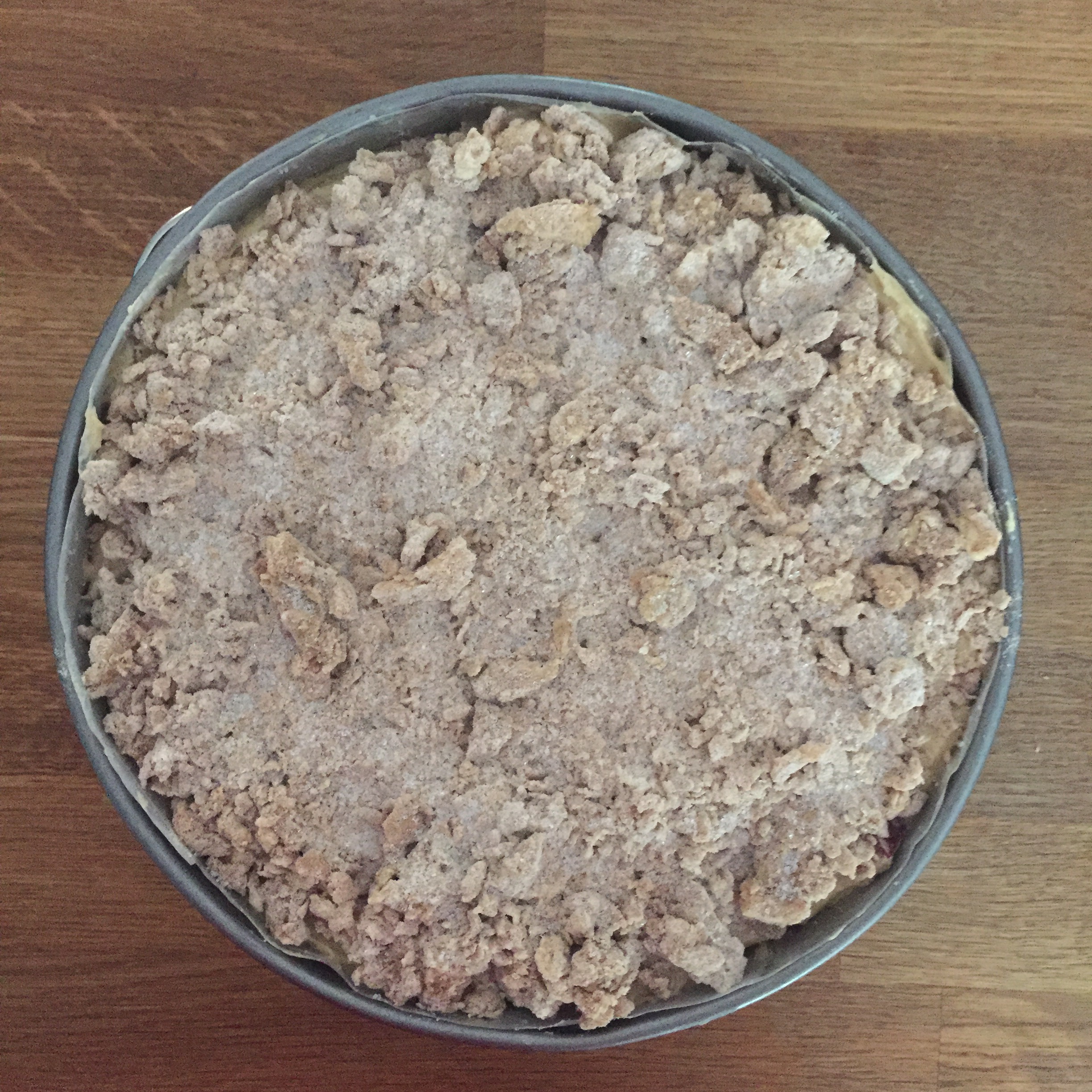Pour cake mix into a lined tin, approximately 20 cm wide. Distribute the crumble mix over the top and bake for an hour uncovered at 160°.
