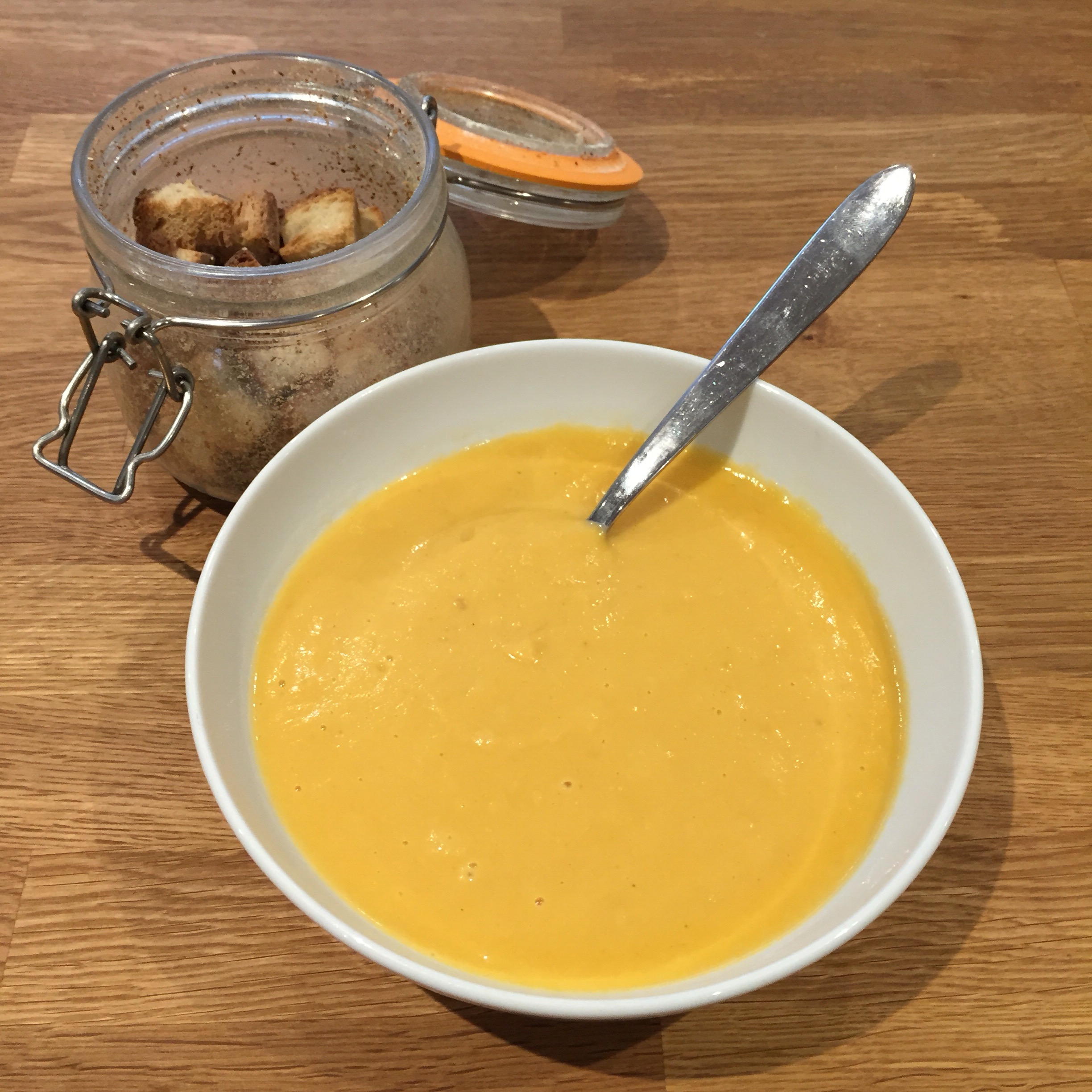 Serve with fresh homemade sourdough or sourdough croutons – the ones in the photo I’ve shaken in a jar with some garlic powder…