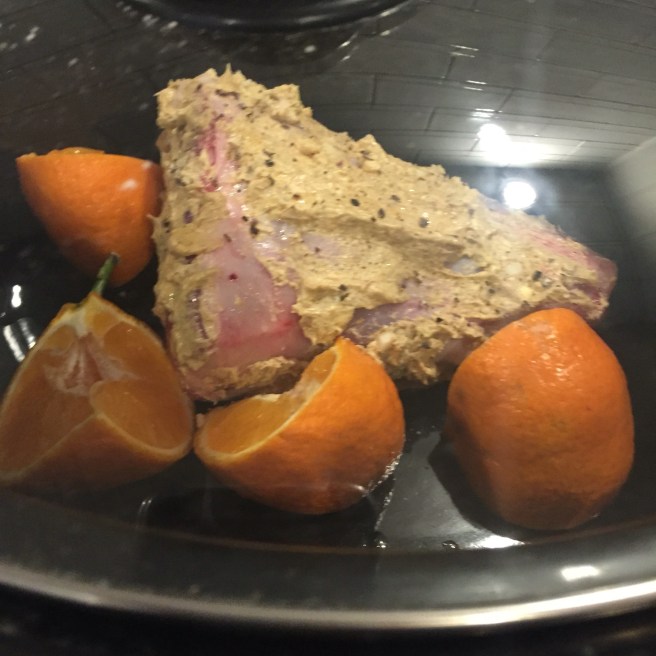 Chop an orange and sit around the meat with a couple of rosemary sprigs